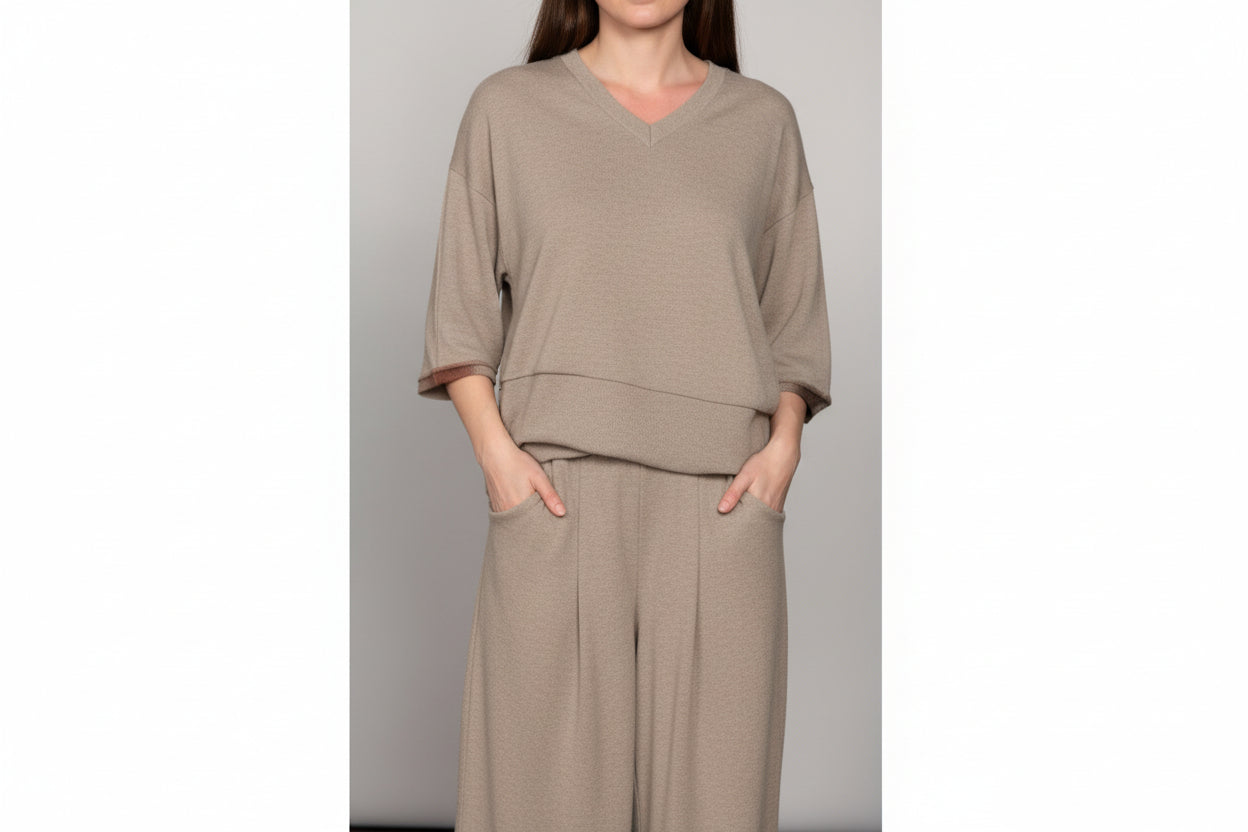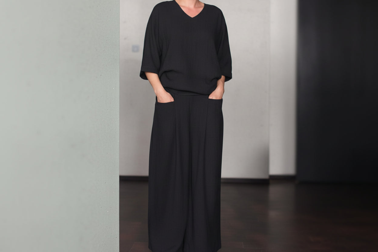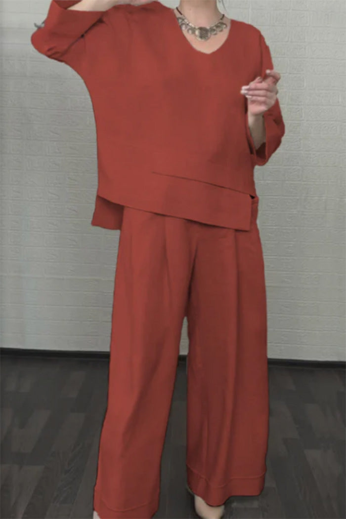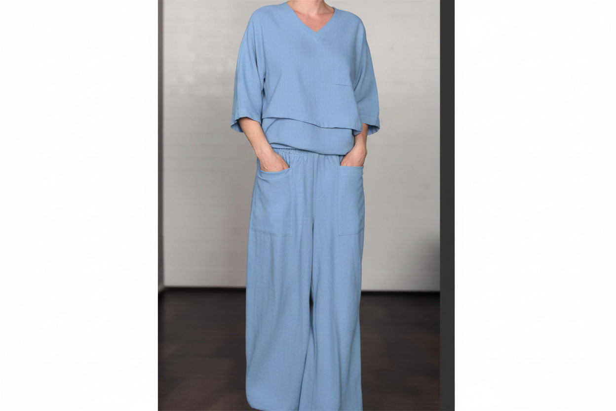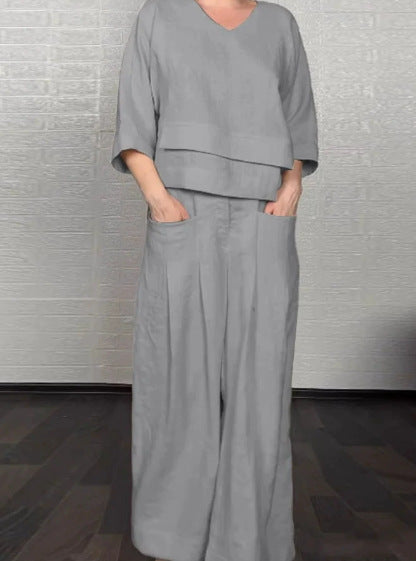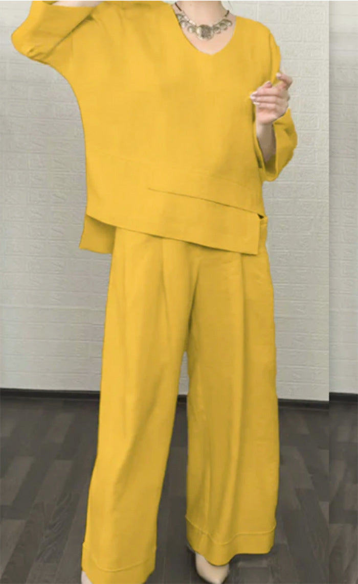 Two-piece set with asymmetrical hem top and 3/4 sleeves, paired with wide-leg trousers with side pockets. Available in sizes S to 4XL in soft, breathable natural fabric.