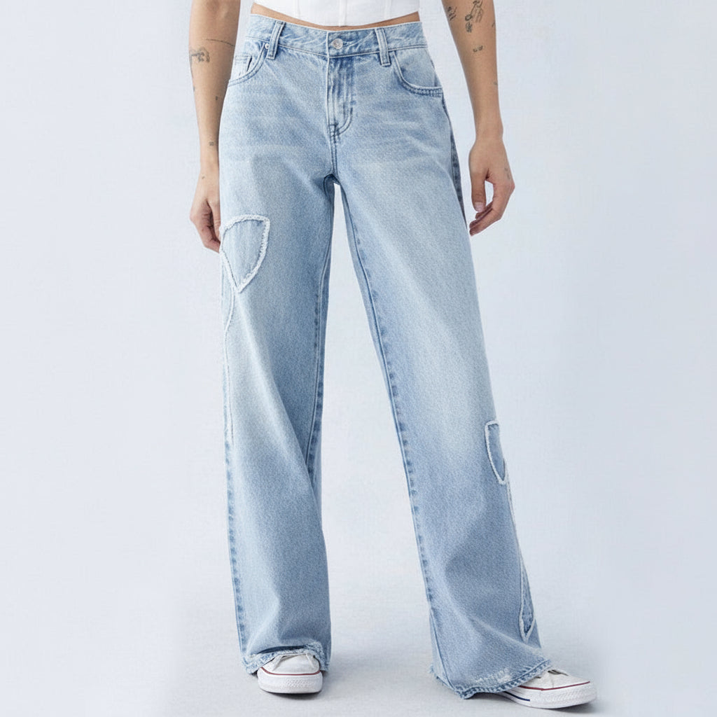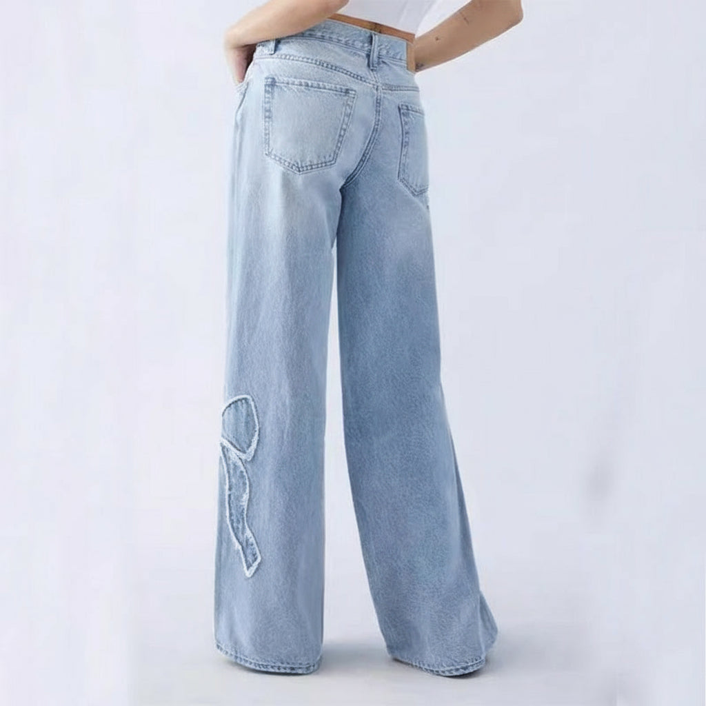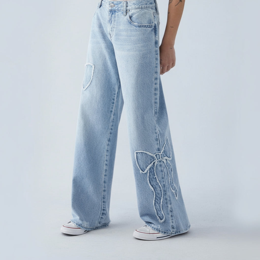 Light jeans with butterfly embroidery, wide and fluid cut. A casual and elegant look, perfect for the season.